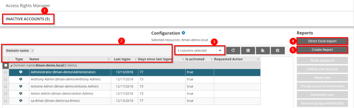 ARM displays all inactive accounts in Active Directory with a last logon older than 30 days. Using ARM, you can identify user accounts that are no longer in use.