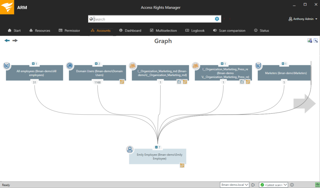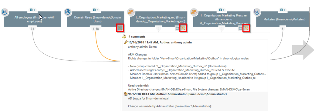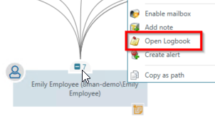 In the Search field, enter targeted user or group name, and then press Enter. For example, Emily Employee.   The Graph view displays on-screen.   The note icon indicates that activities were recorded in the ARM log book. Hover your mouse arrow over the icon for an overview of the latest activities related to the account.