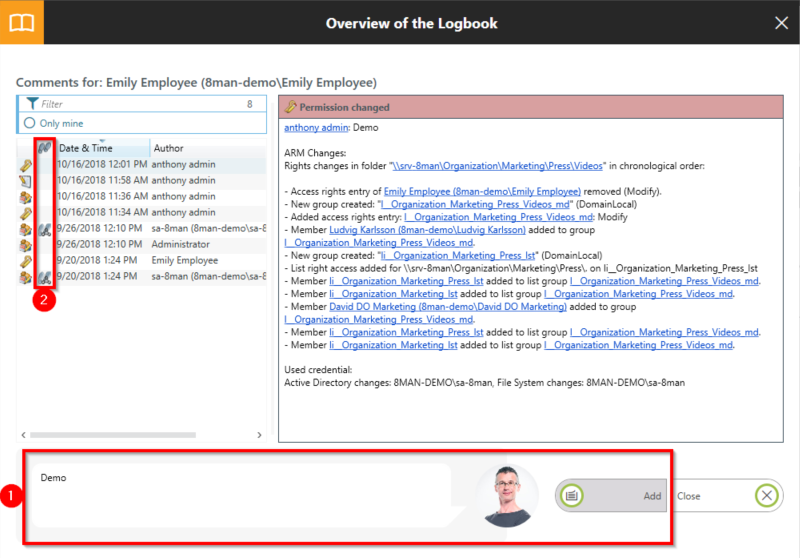 In the Overview of the Logbook window, review the past activities related to a user account.   You can enter an additional comment in the log book (1) at any time. The footprint icon (2) indicates these action were recorded by AD Logga.