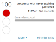 Locate the tile entitled Accounts with never expiring password.   The tile displays a rating for this risk factor. All tiles on the dashboard are sorted by risk level