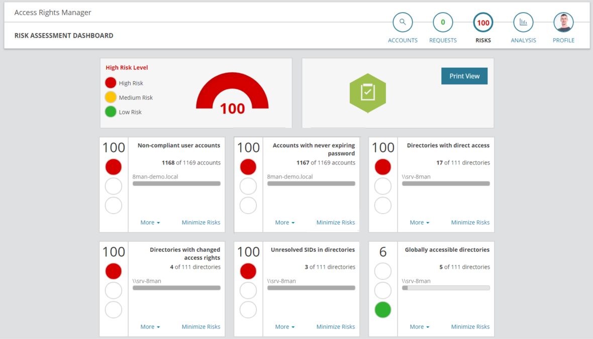 In the toolbar, click Analyze > Risk assessment dashboard. The Risk Assessment dashboard displays on your screen. All tiles in the dashboard are sorted by risk level.