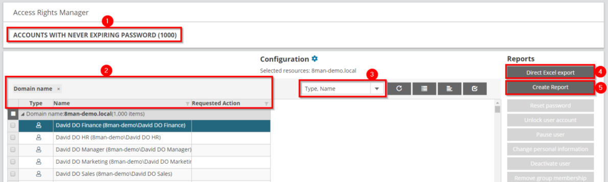 Click Minimize Risks. The Accounts With Never Expiring Password screen is displayed.   The dashboard title displays at the top of the screen (1). Use sorting, filtering and grouping to analyze the data (2). Select the rows to display in the grid and in the reports (3). Click Direct Excel export to export the data in a Microsoft Excel file (4). Click Create Report to create a report in PDF or CSV format (5).