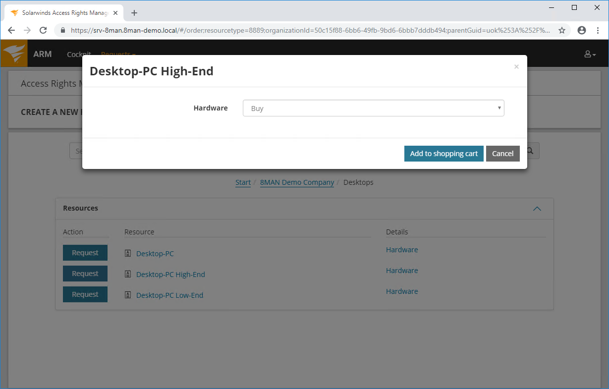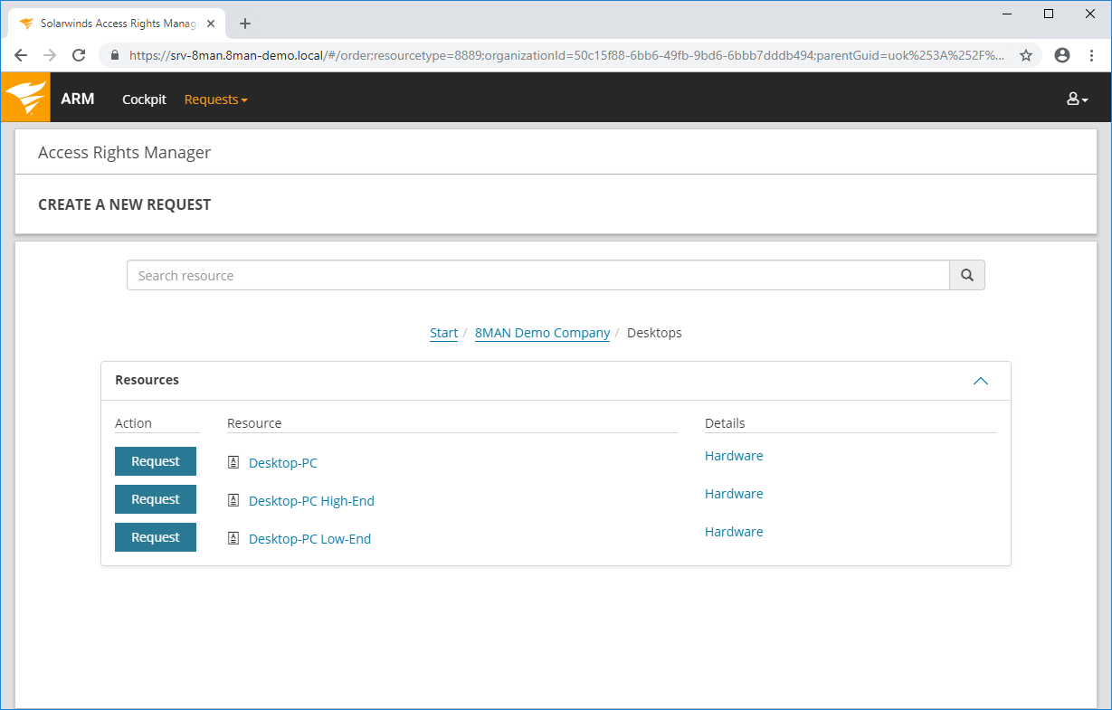 In the Data Owner configuration screen, drag and drop the desired resource from the Resource selection box to the targeted resource under Resources. The resource is automatically marked as requestable.   The requester can find the resource available through Open Order.   Below is an example for a template based on an Open Order request.