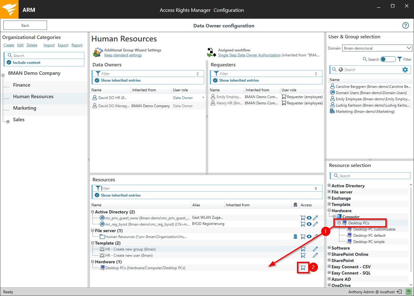 Click Upload to import the XML Resource Configuration.   When the import is completed, the resources are available in the Data Owner configuration and can be assigned to your organizational categories. A copy of the XML configuration is stored at %programdata%\protected-networks.com\8MAN\openOrder.