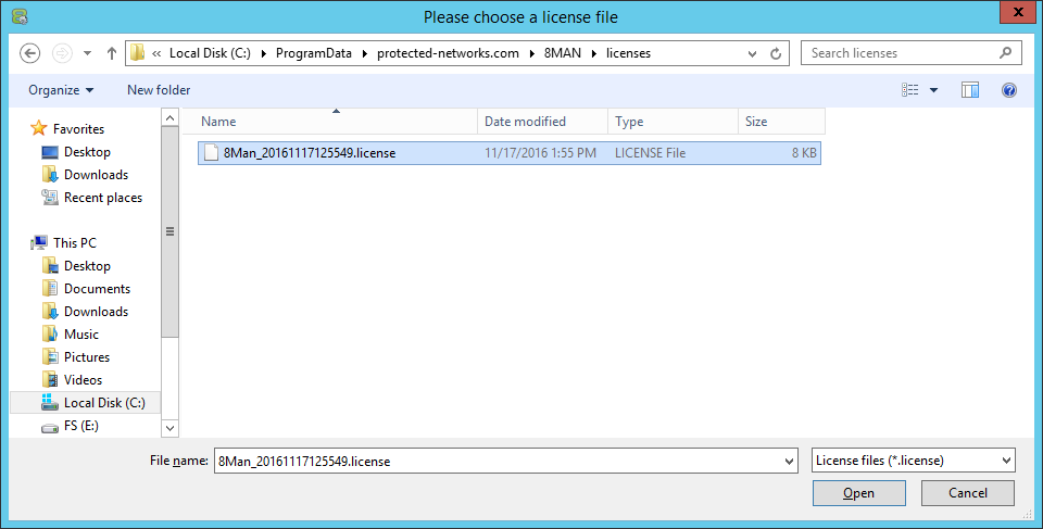 Select the license key, and then click Open.   The license key will be copied to: %ProgramData%\protected-networks.com\8MAN\licensesAll licensed features are activated immediately.