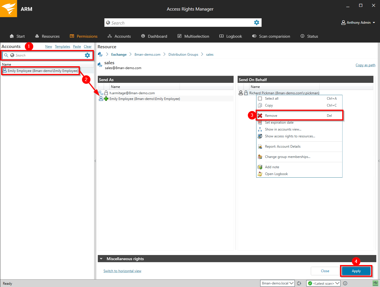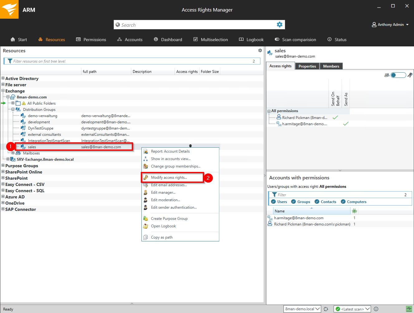 Access Rights Manager allows you to change who can send emails from which distribution groups. As usual, this is automatically documented. The most relevant cases are "Send as" and "Send on behalf". The former is especially sensitive since it is not clearly indicated who actually sent the Email. With "Send on behalf" on the other hand the "deputy" sender is clearly visible.