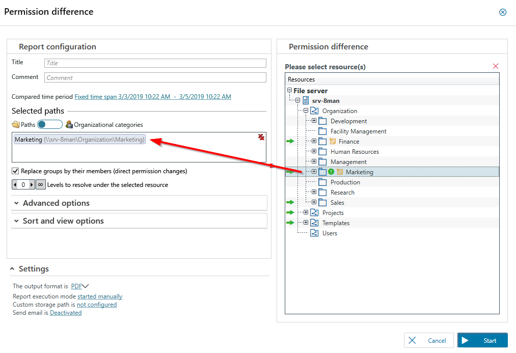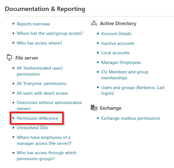 The Permission difference report compares the access rights on your file server at two different points in time and shows you how your access rights situation has changed.