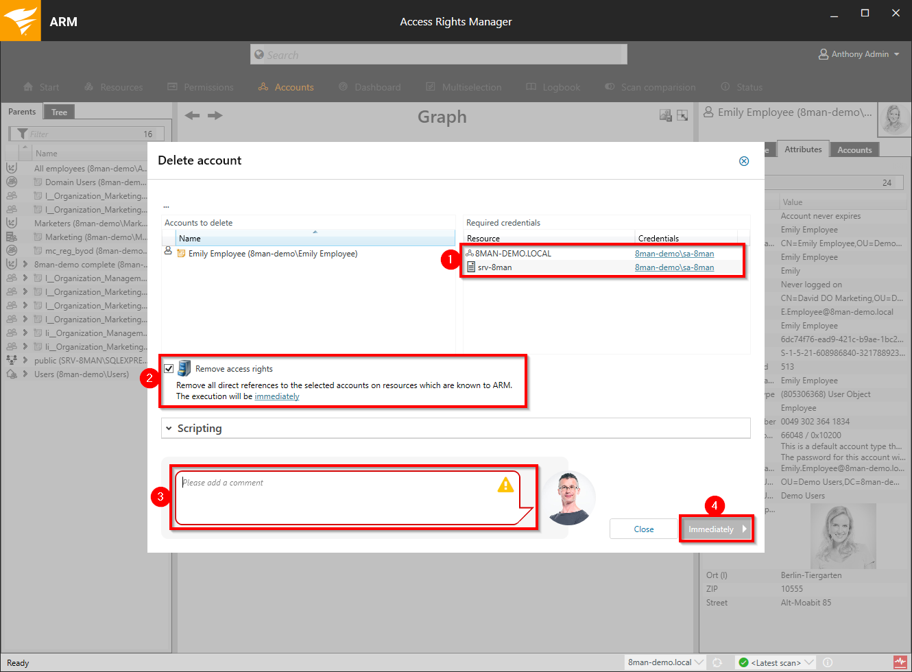 - Strongly recommended: Activate the option "Remove access rights" to avoid unresolved SIDs on file servers.