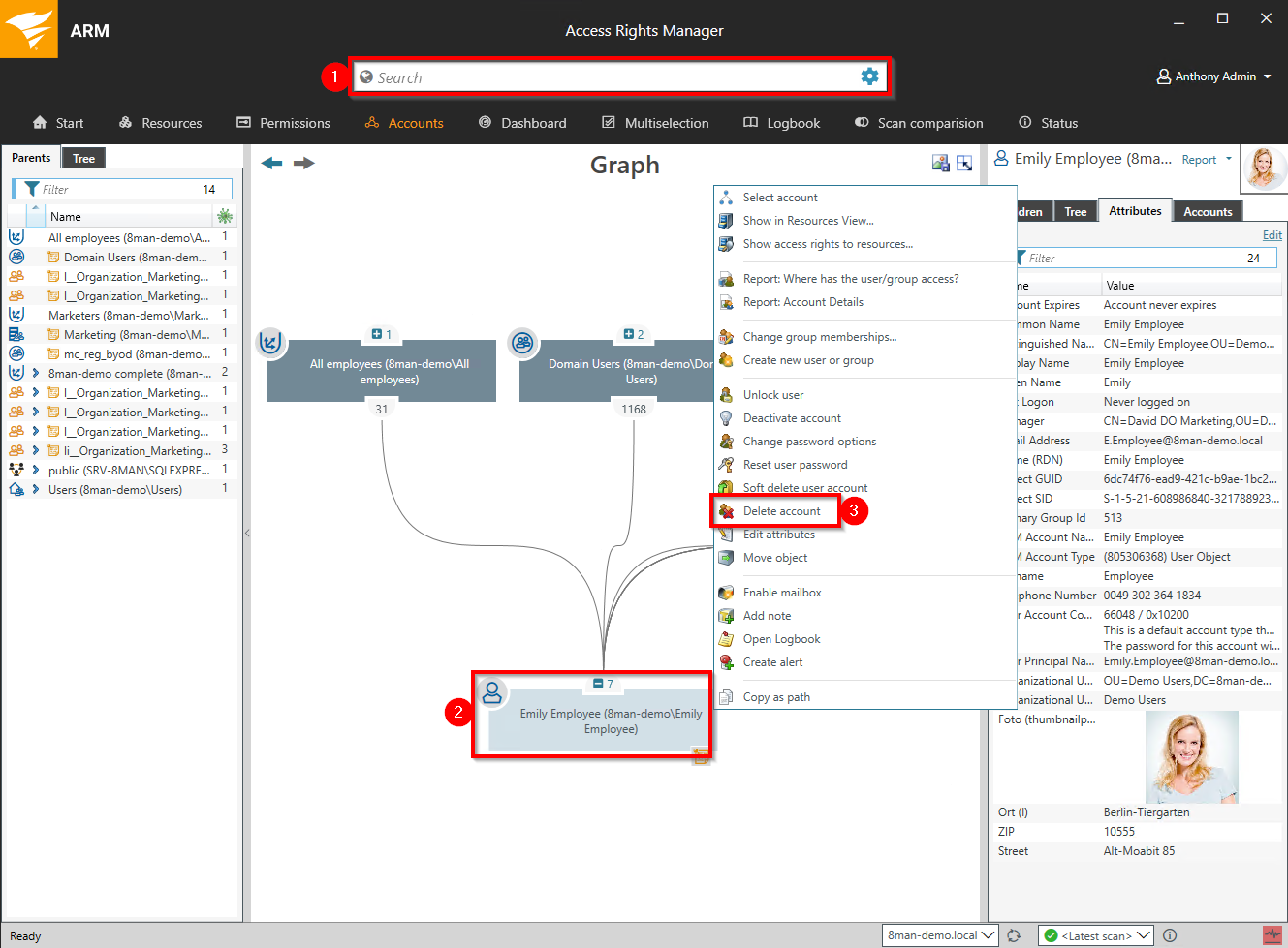 With Access Rights Manager you can delete the user from AD and remove all of their access rights on the file server in one easy action.