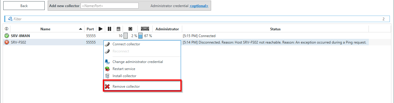 When you remove a connector, the installation on the target system remains intact. To remove the collector software from the target system, use the Windows control panel on the target system.