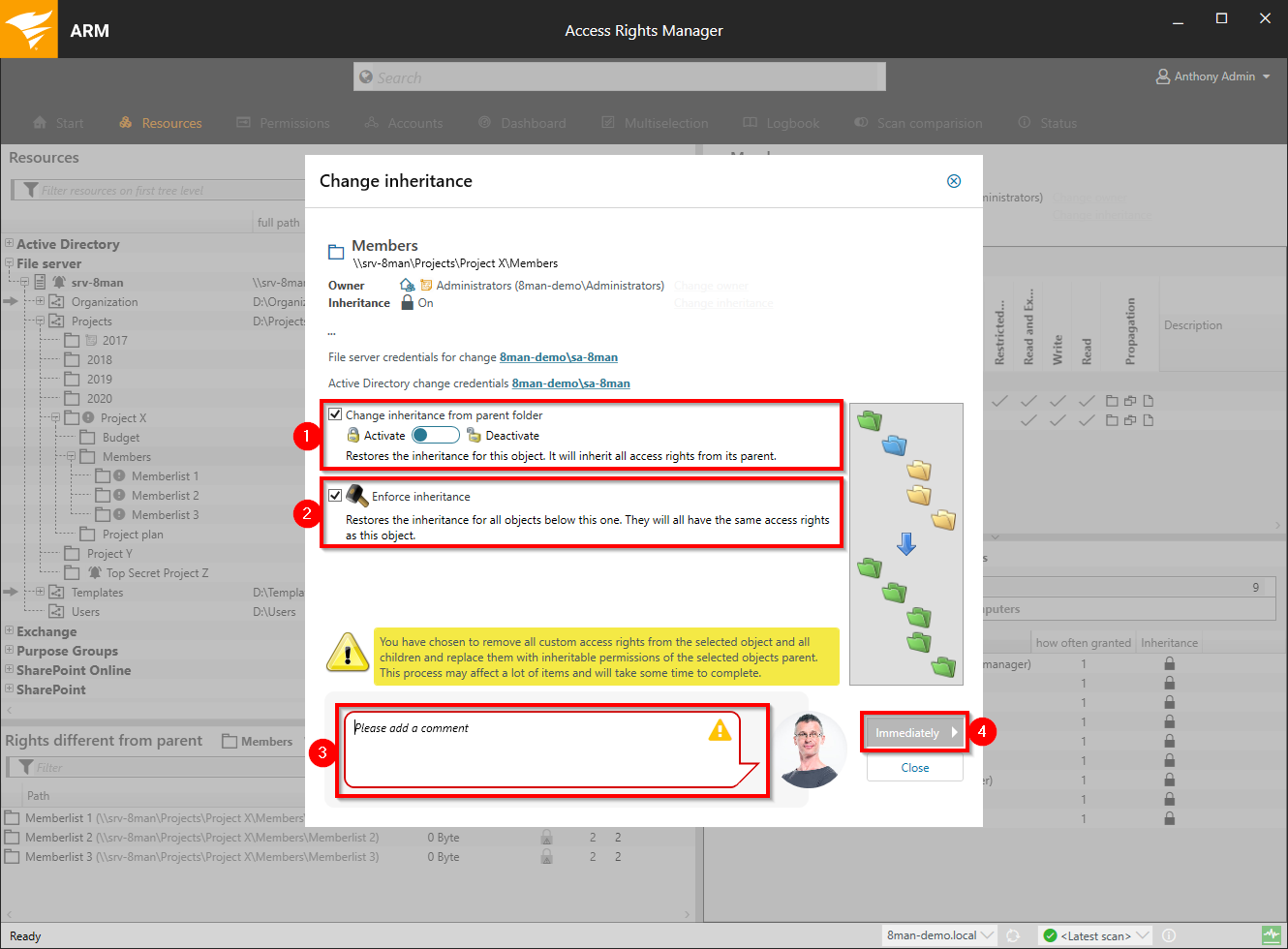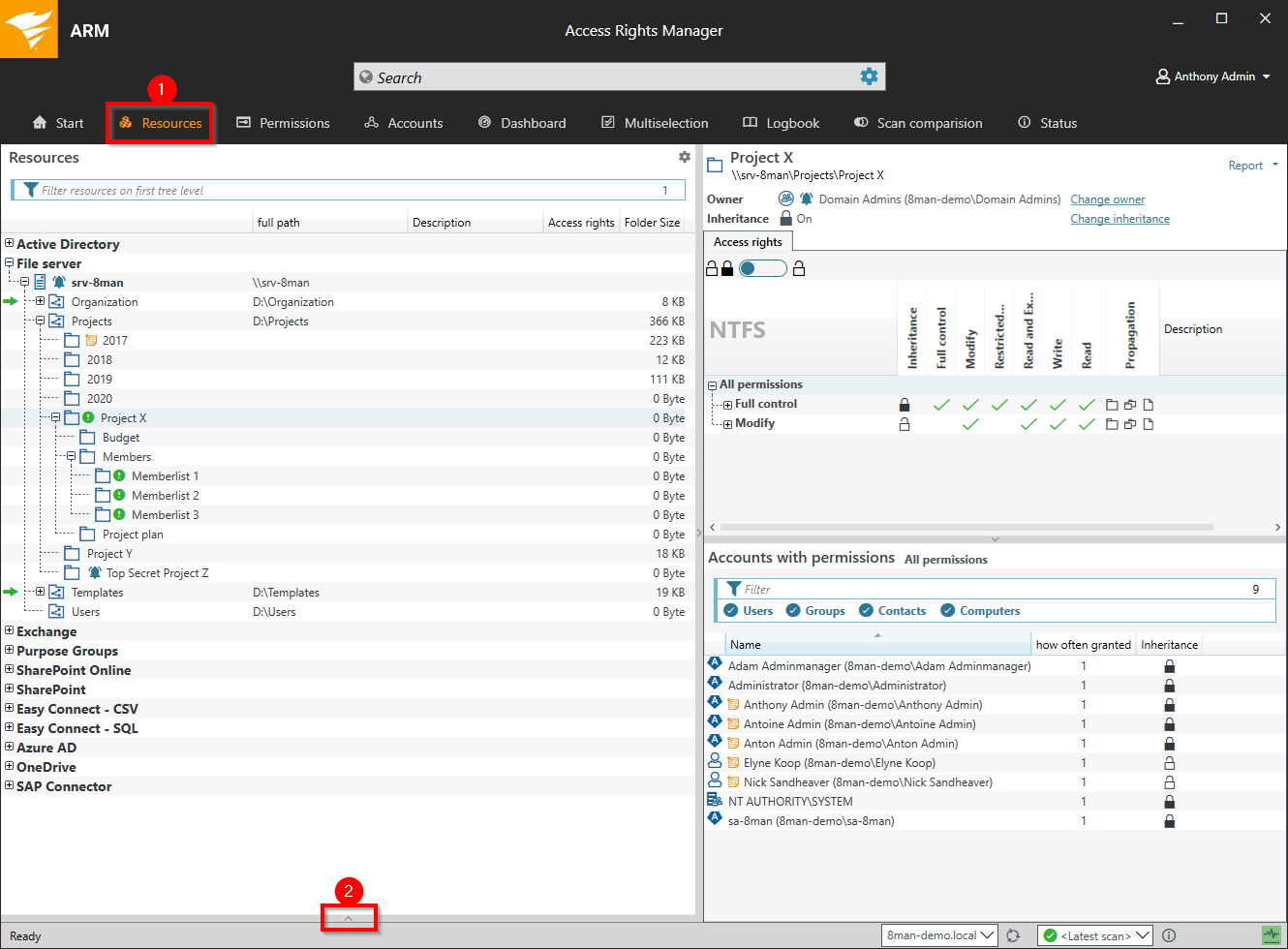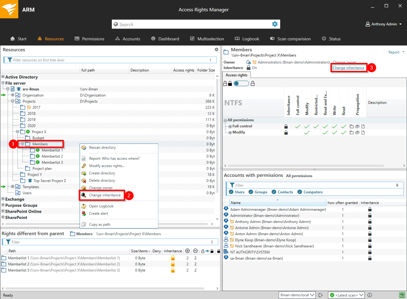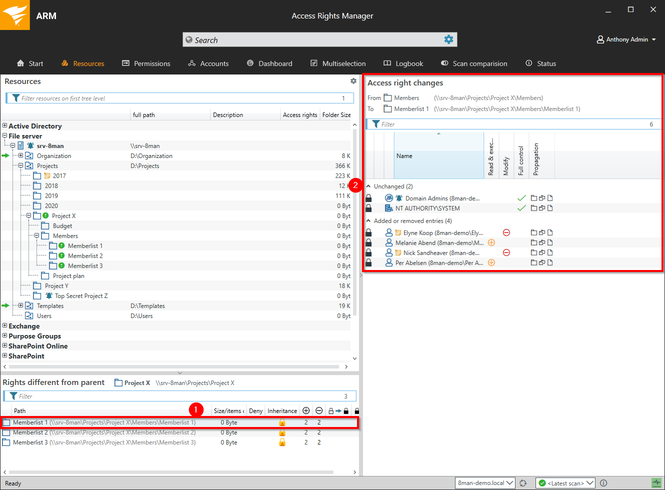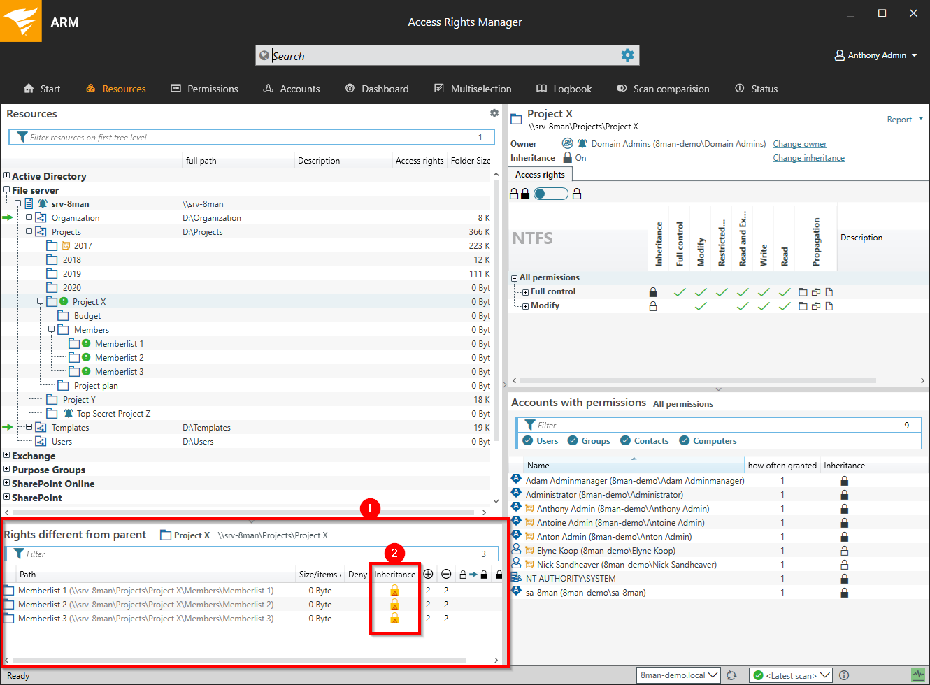- Access Rights Manager shows you in all details which permissions are different compared to the parent directory.