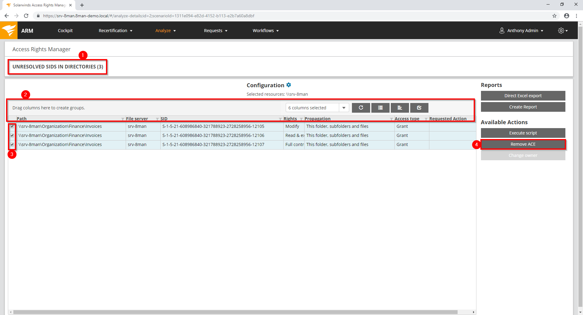 Access Rights Manager clearly identifies unresolved SIDs in your system. Delete unresolved SIDs in bulk using the web client.