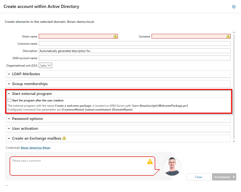 "CommandLineParameters": "{CommonName} {samaccountname} {DomainName}"