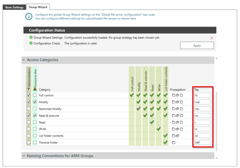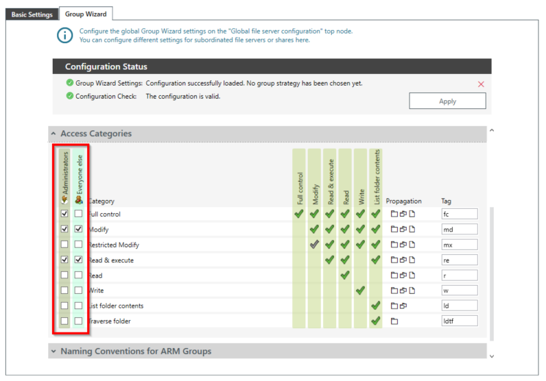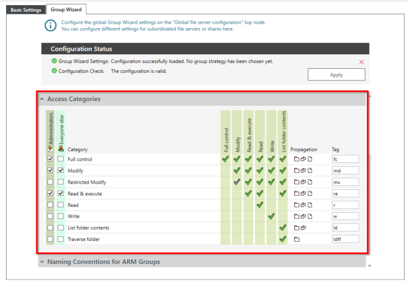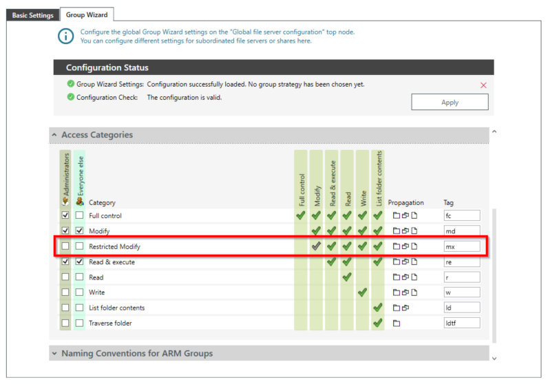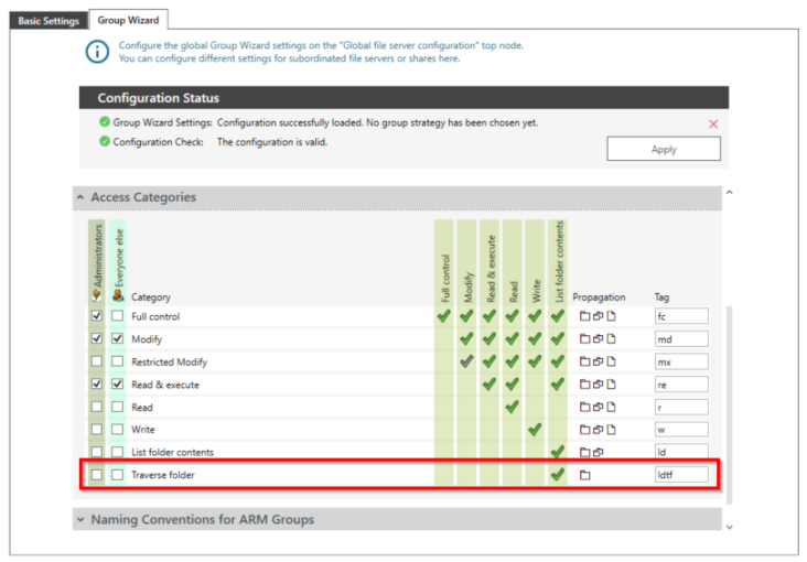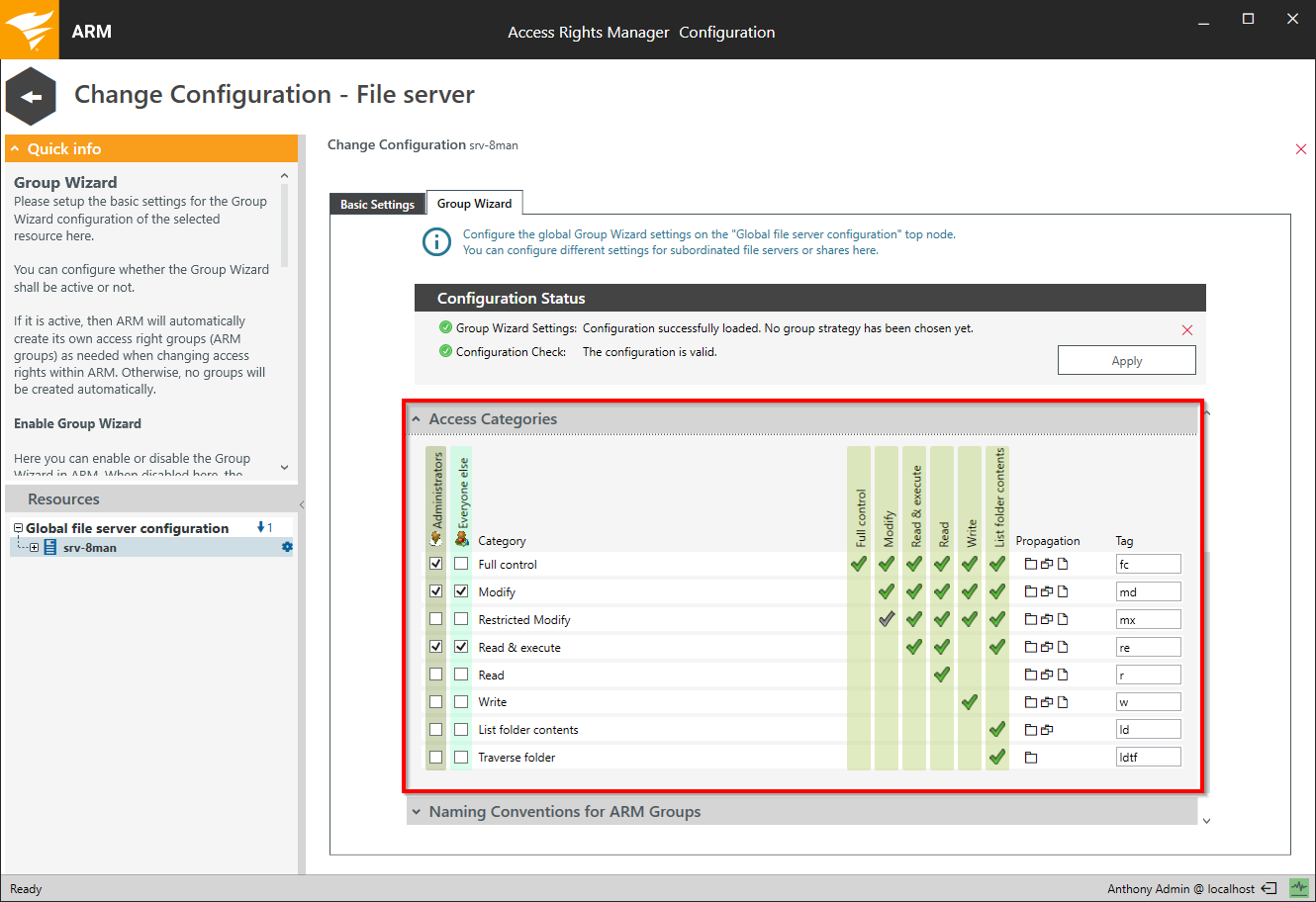 In the Change Configuration - File server window, ARM bundles the Microsoft permission combinations into access categories. This configuration simplifies the access rights assignment.