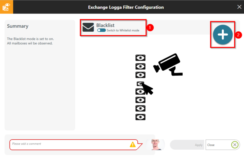Select a mode. Select Blacklist to monitor all mailboxes, including mailboxes you add at a future date. Specify which mailboxes are excluded from monitoring. Select Whitelist to select which mailboxes you want to monitor.
