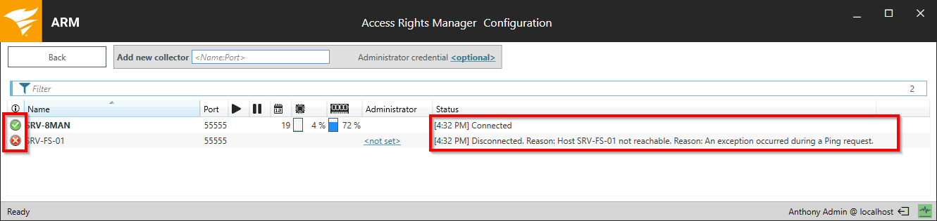 Click the Collectors tile on the home screen. ARM displays the current connection status information. If a red symbol displays in the first column, the collector is not available.   Connection issues are usually caused by firewalls. See the port requirements in the system requirements for more information.