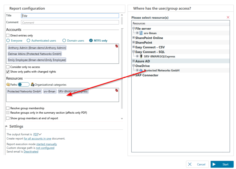 The Where has the user/group access report lists all access rights of users and groups across all selected resources (user in focus).