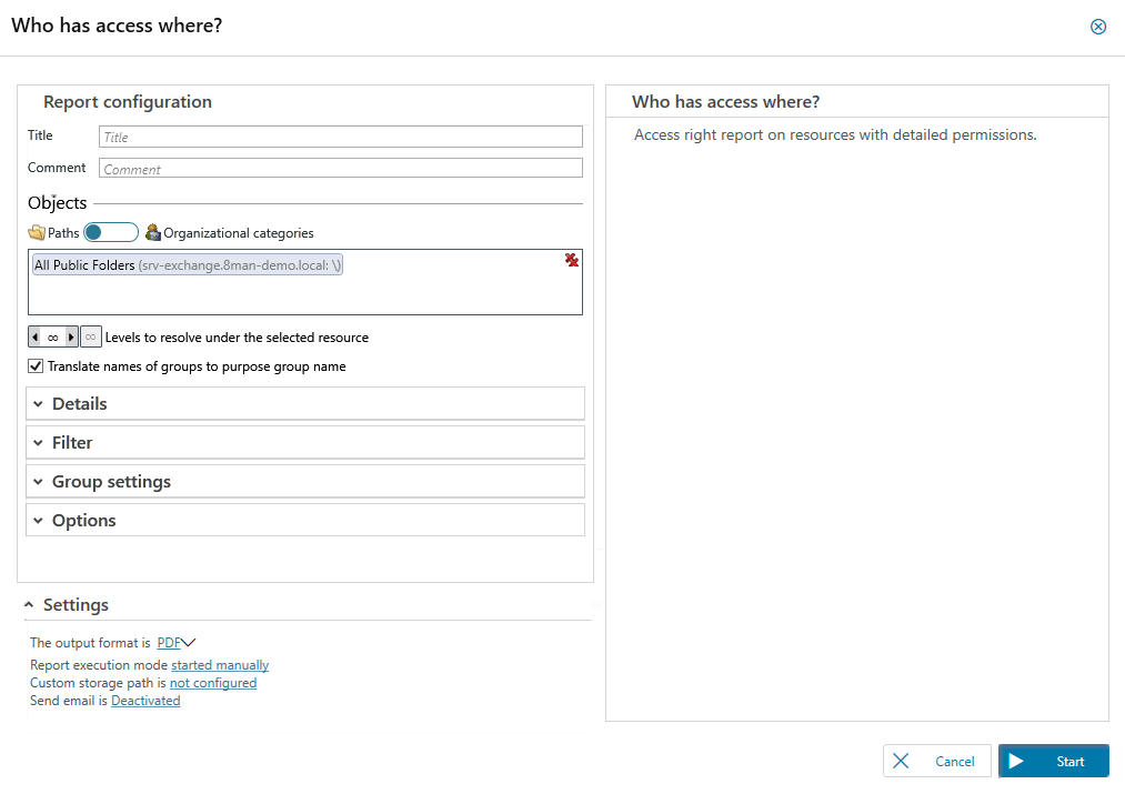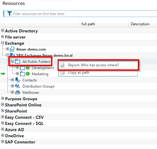The Who has access where report provides an overview of all users and their access to public folders. The report also highlights the access right "send as" due to its potential risk.