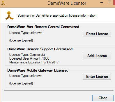 - Click Close on the Dameware Licensor dialog box.
