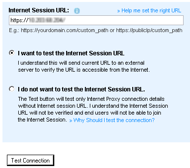 - Enter the Internet Session URL, and click Test Connection.