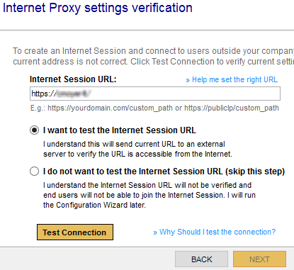 The Internet Session URL is the URL that you send out to your remote end users. This field defines the DNS, which can be a fully qualified name or IP address. The Internet Session URL must be NAT'd to a public IP address.
