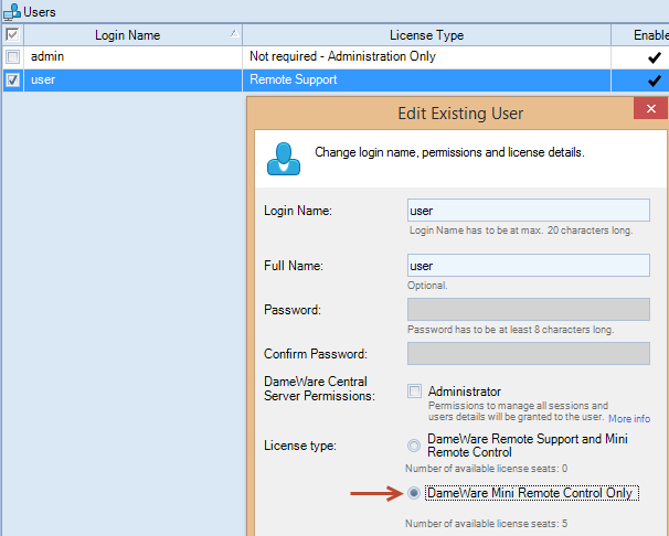 - The default administrator account does not affect your license count because it is not licensed to use Dameware Remote Support, Dameware Mini Remote Control, or the Dameware Mobile Client.