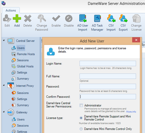 Technicians who use either Dameware Remote Support or Dameware Mini Remote Control to support end users must be created as users in the Dameware Administration Console. Manually add users if you have a small number of Dameware users. If you have a large number of Dameware users, then you can import them from Active Directory, or import them from a file. If you have a large number of Dameware users, then you can import them from Active Directory or a CSV file.