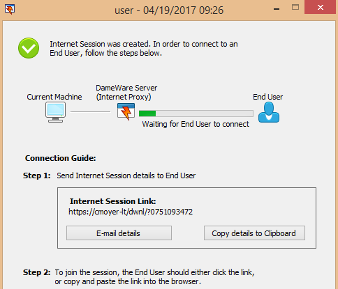 - Click E-mail details or Copy details to Clipboard, and notify the remote user of the Internet Session URL.