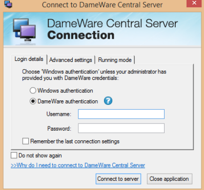 - Select Windows authentication or complete the Dameware authentication credentials, and click Connect to Server.