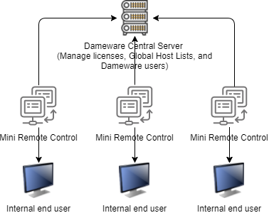 The following diagram illustrates how Dameware Mini Remote Control works with the Dameware Central Server to support end users.