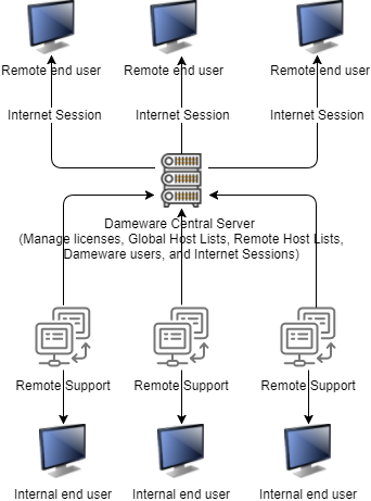 The following diagram illustrates how Dameware Remote Support works with the Dameware Central Server to support end users.