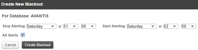 Select the alert, database instance, or alert group, and then click Add Blackout.