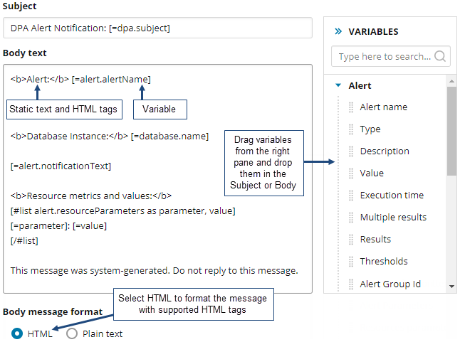 Drag and drop variables from the right panel into the Subject line or body (or type the variables). These variables represent information about the triggered alert or links to additional information in DPA. For information about the available variables, see Email template variables.