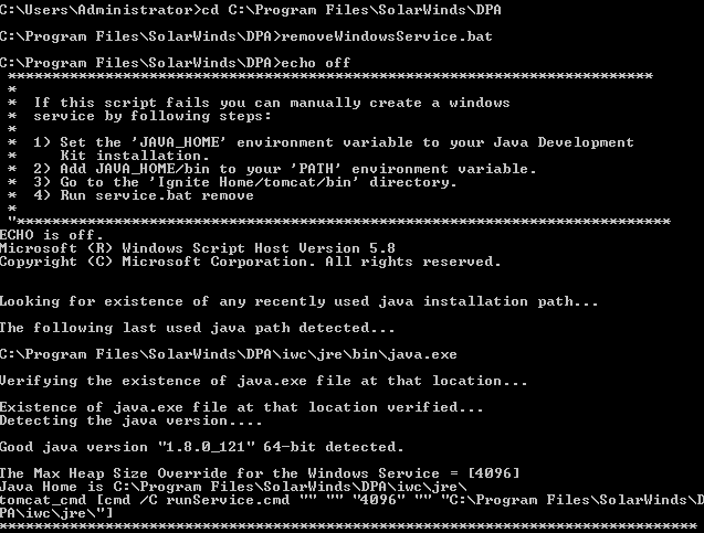 .batfile to execute it, the file might not run because of user access control settings, or it might appear to run but won't change the memory setting.C:\Program Files\SolarWinds\DPA\removeWindowsService.bat