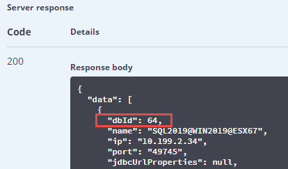 Scroll through the Response body, find the database name, and make a note of the associated ID.
