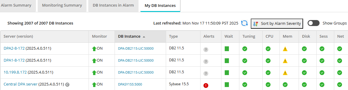 By default, the tables on the DB Instances in Alarm tab and the My DB Instances tab are sorted by the DPA server name or IP address. To put the instances with the most severe issues at the top of the list, click Sort by Alarm Severity.