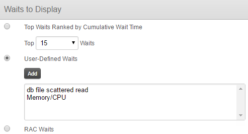 The following example creates a report to track wait types for a specific SQL statement. If you made changes to reduce a specific type of wait for a SQL statement, you can use this report to determine if your tuning efforts were effective.
