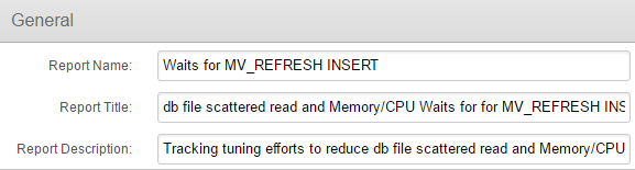 Report Name Enter a unique name to identify this report in the report list. Report Title (Optional) Enter a title to display at the top of the report. If you leave this field blank, the report title defaults to the report type, database instance, and time period. Report Description (Optional) Enter a description to explain the report's content or purpose.