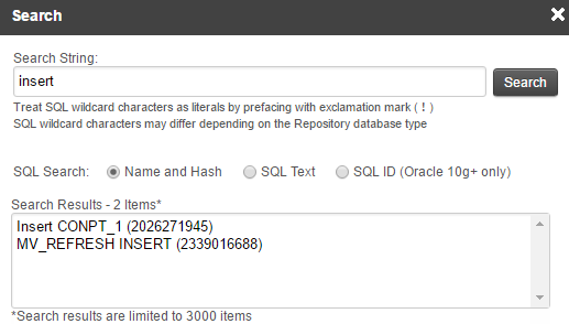 The Search Results lists all SQL statements run against the selected database instance that match your criteria.