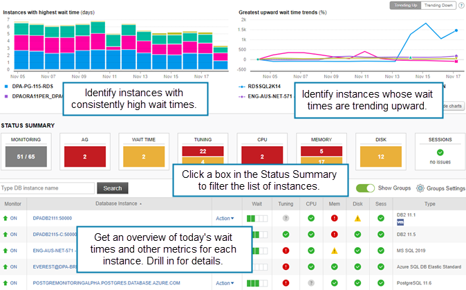 Use the DPA home page to quickly identify database instances with high wait times or anomalies, and then drill down for details.