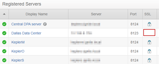 Verify that every server has a lock in the SSL column. If a server's SSL column does not display a lock, DPA Central is configured to connect to that server over HTTP.