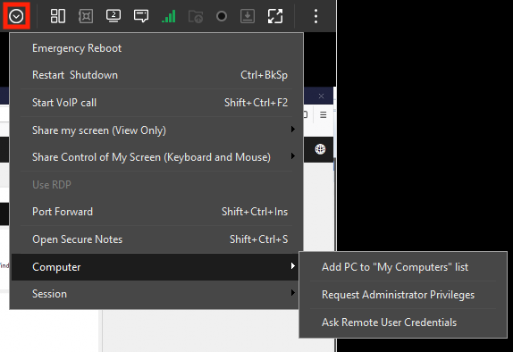 - Request Administrator Privileges – requests admin level permissions when the Applet is running with limited privileges. Required Administrator credentials are provided either by the customer or by the technician, but the customer always has to explicitly authorize the elevation if UAC (User Account Control) is enabled. The remote Applet restarts, and causes the connection to break, but the session resumes when the Applet comes back online. This feature is available in the Applet only.