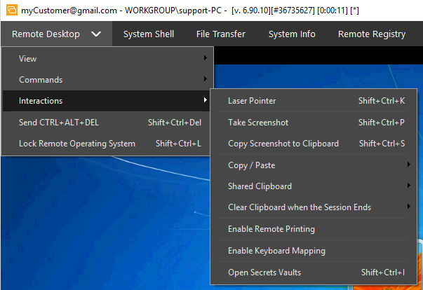Interact with the remote computer during a support session