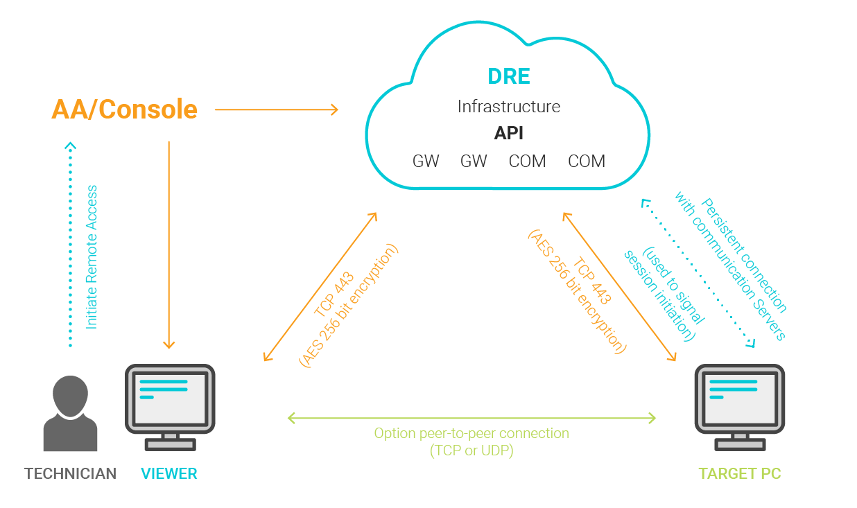 Dameware Remote Everywhere does not have access to session content. All encryption is based on an end-to-end negotiation that does not intercept transferred information or decode the information in the gateway. Encryption keys are randomly generated for each session.