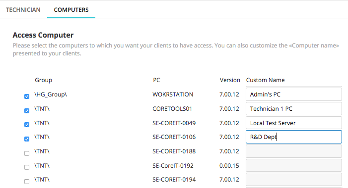 After saving the End User, the Permissions and Default Settings tabs of the Technician Configuration window are replaced with the Computers tab, where you can choose which devices the End User can access. Select the Computers tab, and use the Custom Name field to change the name of each computer to which the end user has access. Each device's Custom Name is displayed in the End User area.