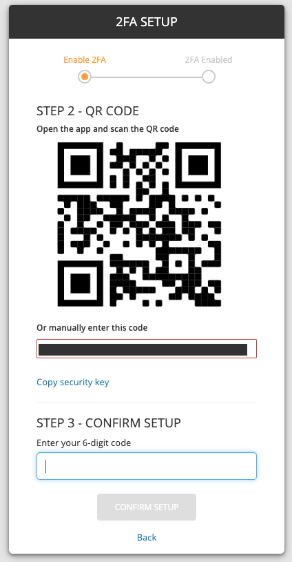 Open the downloaded authentication app and scan the QR code using your device, or copy the security key to enter it manually. Enter your 6-digit code. Click Confirm Setup to finish.