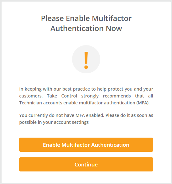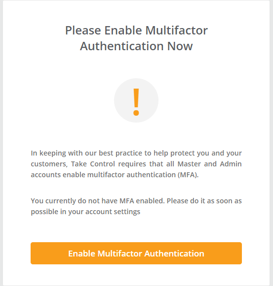 Log into the Admin Area or Tech Console. Technician, Admin, and Master accounts are required to set up MFA. Click Enable Multifactor Authentication.