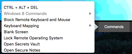 The Commands menu in the Mac Viewer Console contains the following actions that send an order to the remote computer. You can also open the Password Secrets Vaults and Secure Notes.