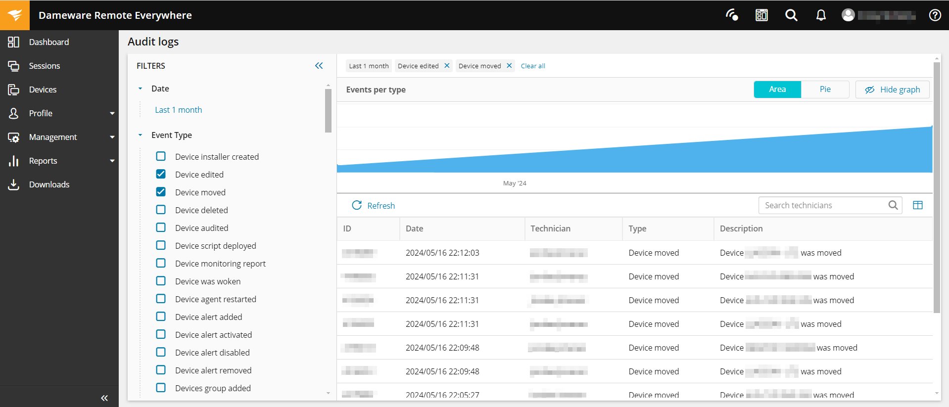 View audit logs reports in the Admin Area by navigating to Reports > Audit logs. Filter actions performed by Technicians by date and event type. View the filtered events using a graph, pie chart, or list. See Audit logs in DRE for details.