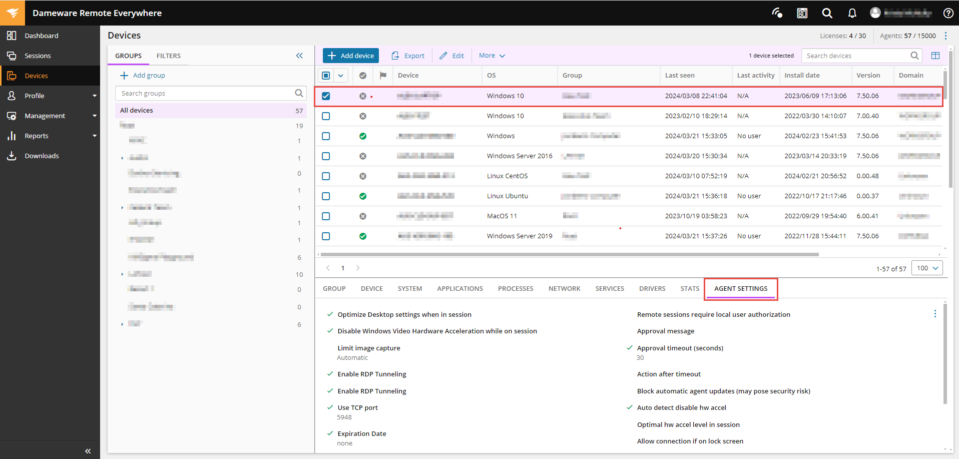 Dameware Remote Everywhere has extended capability for monitoring information related to devices running the macOS Agent. Technicians can now view additional information in the Group, Device, System, Applications, Processes, Network, Daemon, Drivers, and Stats tabs in the bottom pane of the Devices tab in the Admin Area.